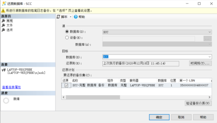 - 在打开的 "还原数据库 - SCC" 窗口中,单击 "选择页" 区域中的 "常规" 选项,在 "源" 选项区域的 "数据库" 下拉列表中选择要恢复的数据库 SCC,如图所示。