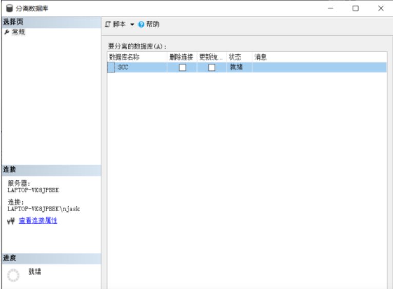 (1)使用 SSMS 对象资源管理器将 SCC 用户数据库分离。