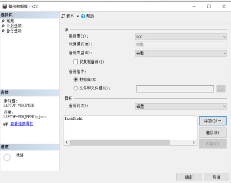 - 在 "备份数据库 - SCC" 窗口中,单击右下角的 "删除" 按钮,删除当前默认备份目标,然后单击 "添加" 按钮,打开 "选择备份目标" 对话框,在该对话框中选定备份设备 BackDisk1,单击 "确定" 按钮,如图所示。