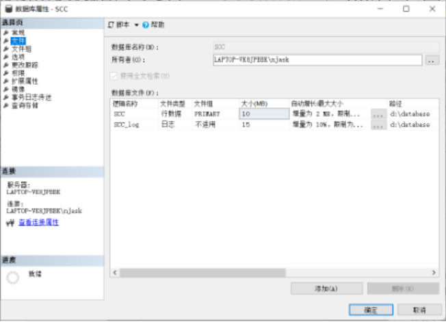 - 启动 SSMS 对象资源管理器,展开 "数据库" 节点,右击 SCC 数据库,选择 "属性" 命令,打开 "数据库属性" 对话框,单击 "选择页""文件" 标签,可以查看数据库文件和日志文件在磁盘中的位置。如图 27-1 所示。