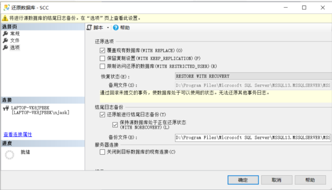 - 单击 "选择页" 区域中的 "选项",在右侧窗口中选择 "覆盖现有数据库" 选项,在 "恢复状态" 中使用默认选项,如图所示。