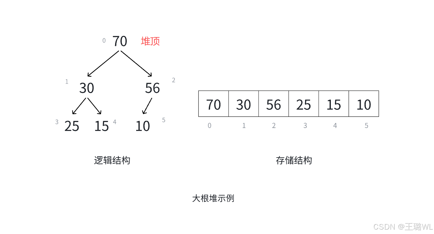 如果有⼀个关键码的集合 ,把它的所有元素按完全⼆叉树的顺序存储⽅式存储,在⼀个⼀维数组中,并满⾜++子结点的值不大于(不小于 )父结点的值则称为大堆(或小堆)++。