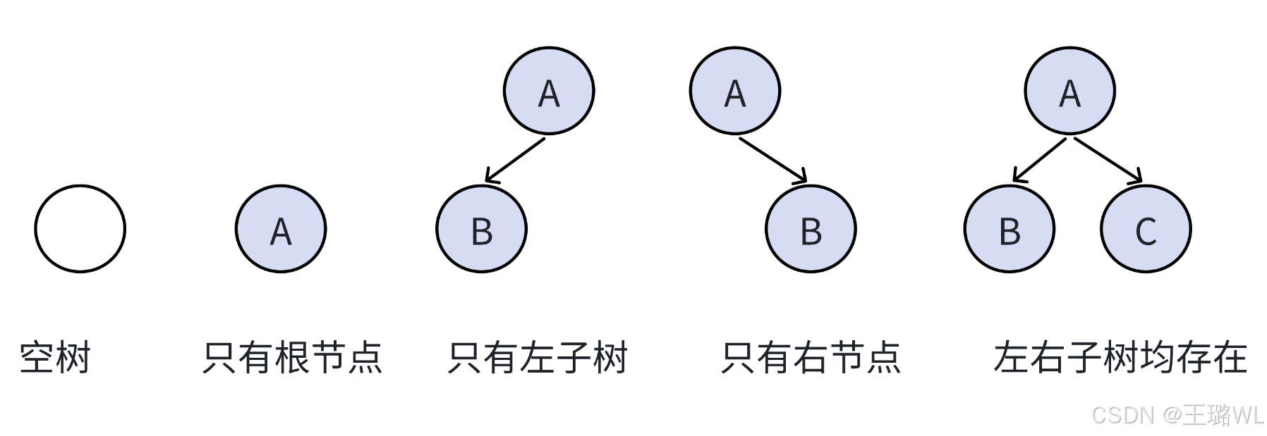 注意:对于任意的⼆叉树都是由以下⼏种情况复合⽽成的现实中的⼆叉树