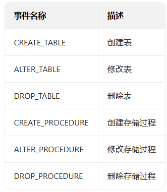 参数说明:FOR | AFTER,DDL 触发器只能指定 FOR 或 AFTER 触发器,和 DML 触发器有相同的功能。但是 DDL 没有 INSTEAD OF 类型触发器。