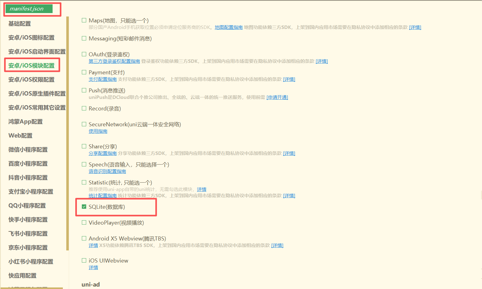 打开 manifest.json,进入「App模块权限配置」,勾选 SQLite (数据库) 选项