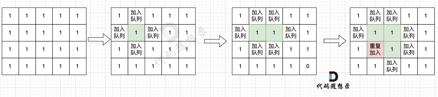 bfs有一个值得注意的点,只要是加入队列就代表走过了,就需要标记,而不是从队列拿出来的时候再去标记走过,如果从队列拿出结点再标记,就会出现以下情况,导致节点重复加入队列: