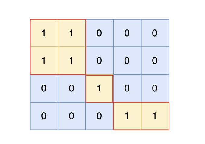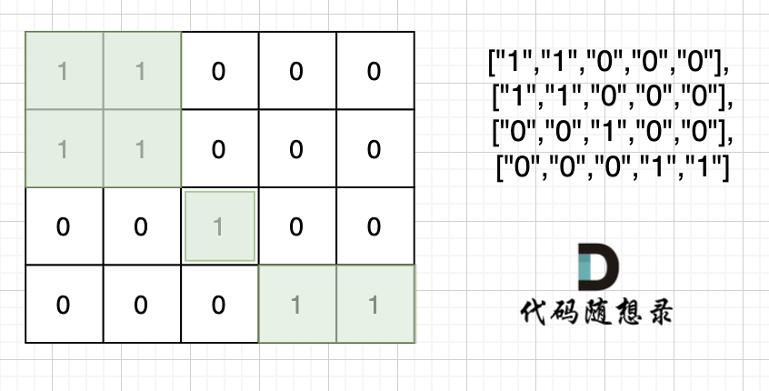 本题中的每座岛屿都只能由水平方向和/或竖直方向上相邻的陆地连接形成,也就是说斜角度的连接是不算数的,如图,这是三个岛屿: