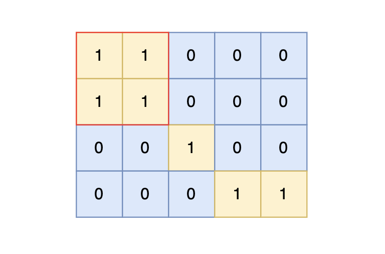 第一行包含两个整数 N, M,表示矩阵的行数和列数。后续 N 行,每行包含 M 个数字,数字为 1 或者 0,表示岛屿的单元格。