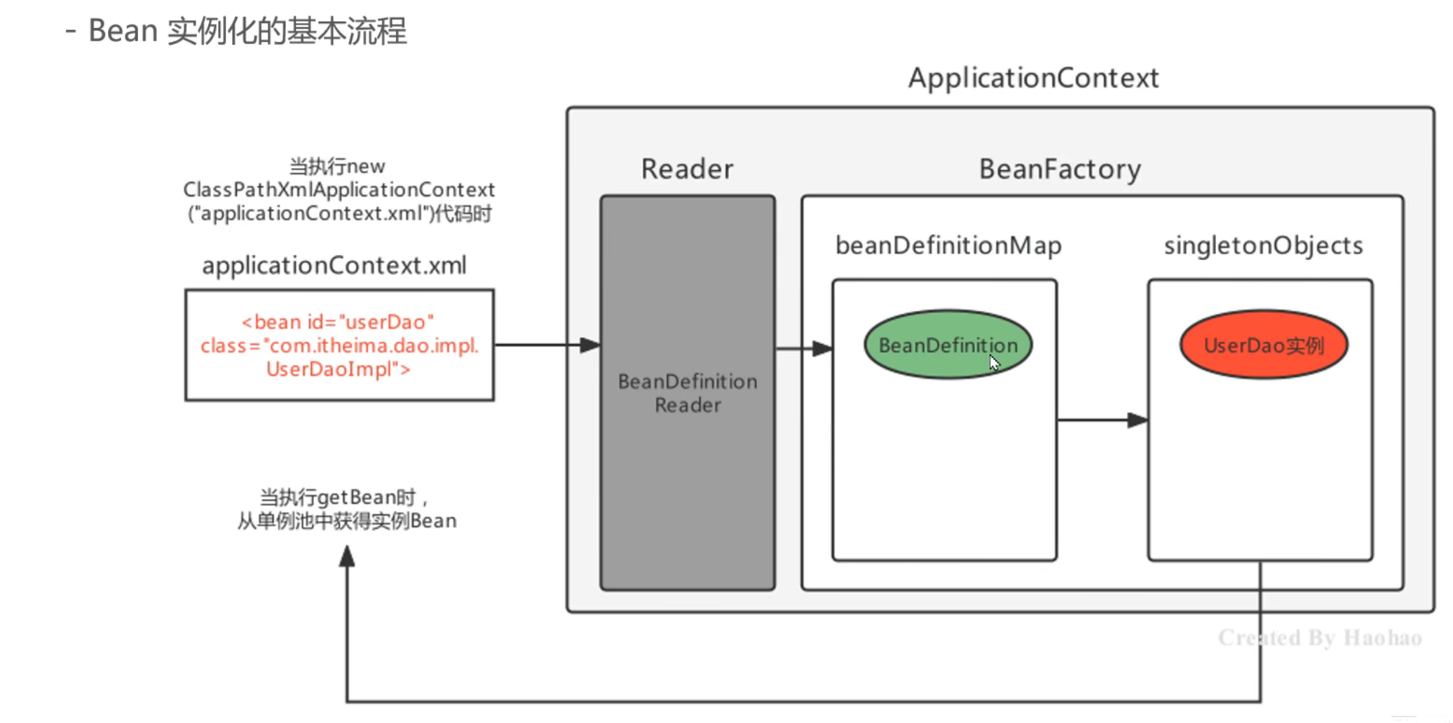 Spring容器在进行初始化时,会将xml配置的< bean>的信息封装成一个BeanDefinition对象,所有的BeanDefinition存储到一个名为beanDefinitionMap的Map集合中去,Spring框架在对该Map进行遍历,使用反射创建Bean实例对象,创建好的Bean对象存储在一个名为singletonObjects的Map集合中,当调用getBean方法时则最终从该Map集合中取出Bean实例对象返回。