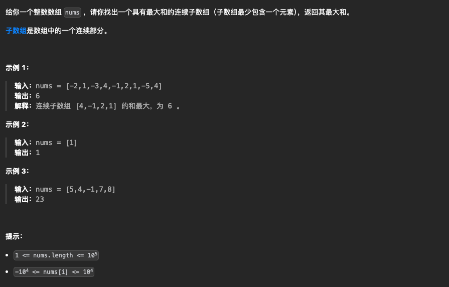 int sum = 0, maxSum = nums[0], curMax = 0;