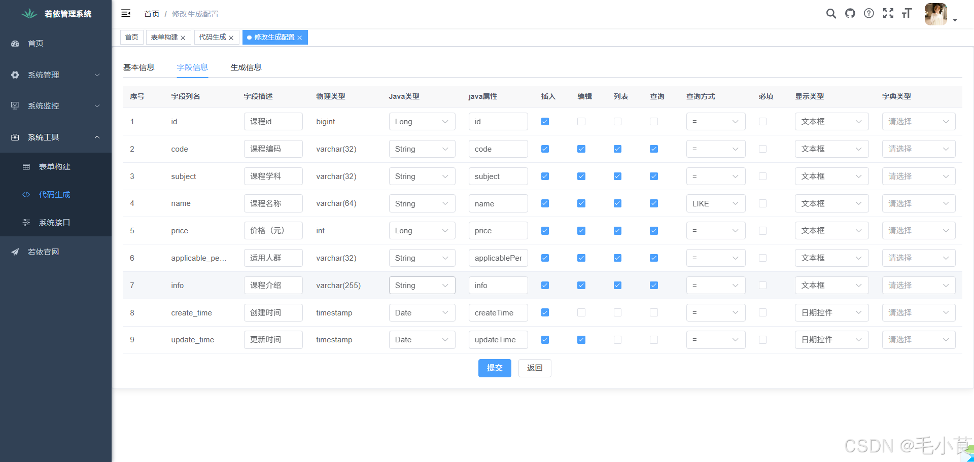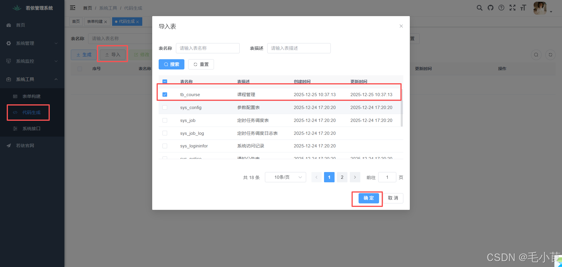 - 登录若依后台 → 进入 系统工具 → 代码生成