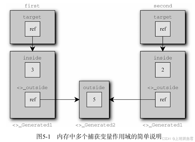 - 作用域在循环外的变量 :被提升到外层闭包类,全程只有一个实例,所有委托共享(引用传递)。
