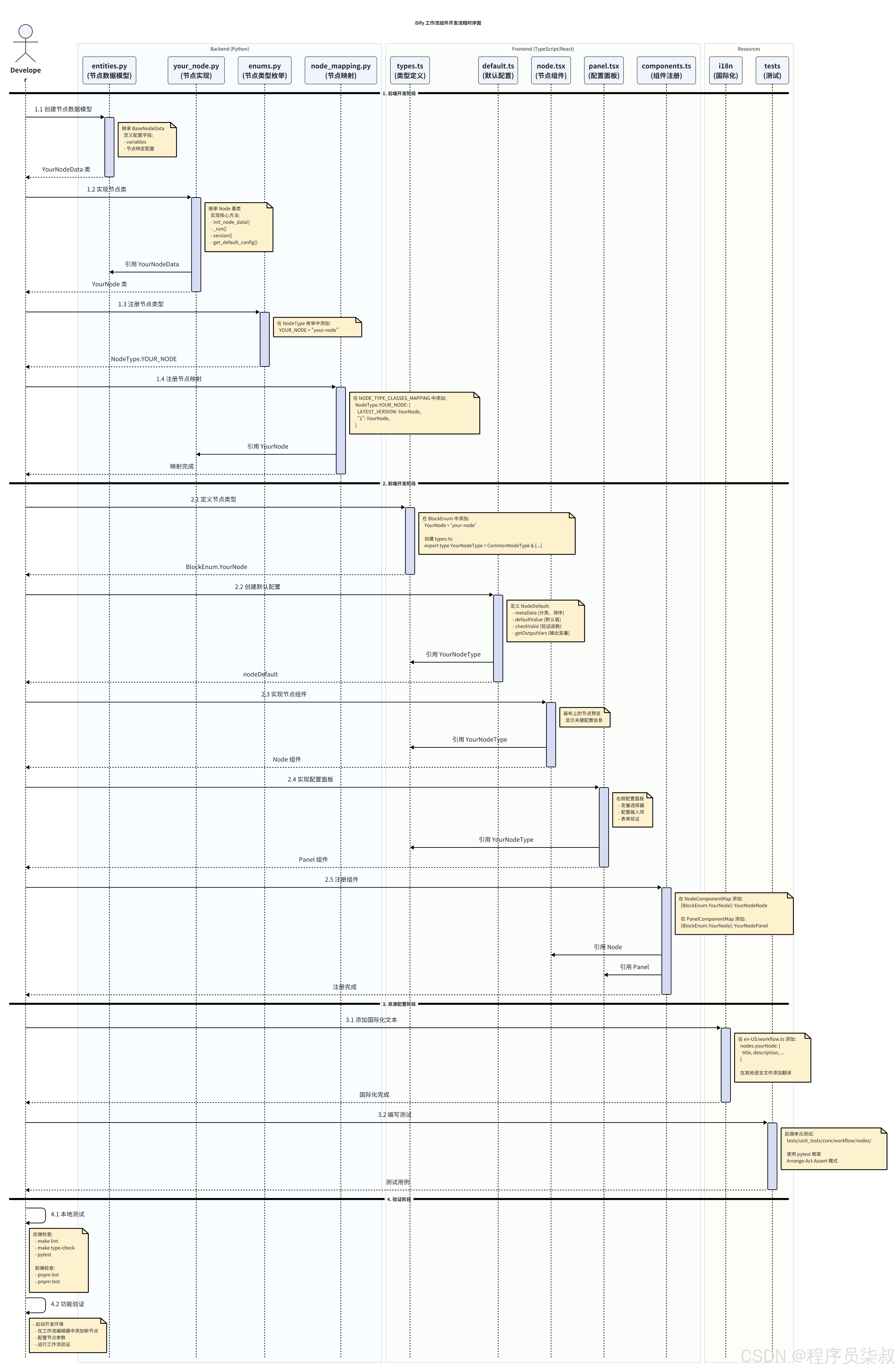 Dify 工作流采用前后端分离架构,开发一个新的工作流节点组件需要同时在**后端(Python Flask)和前端(Next.js + React)**进行开发。