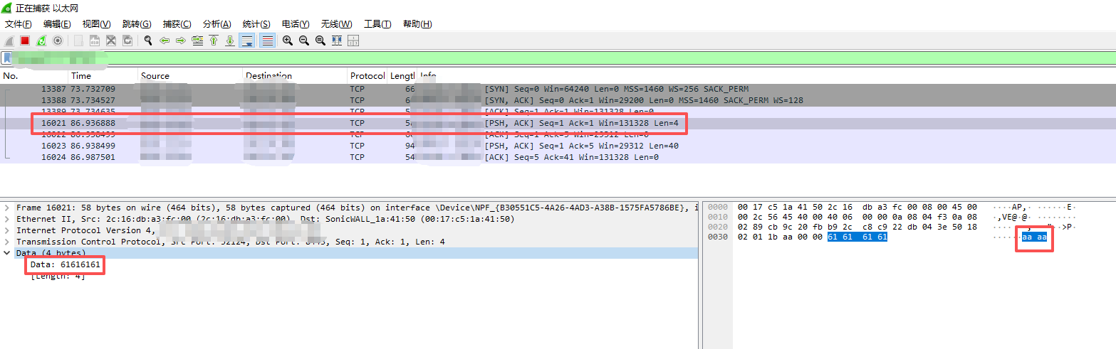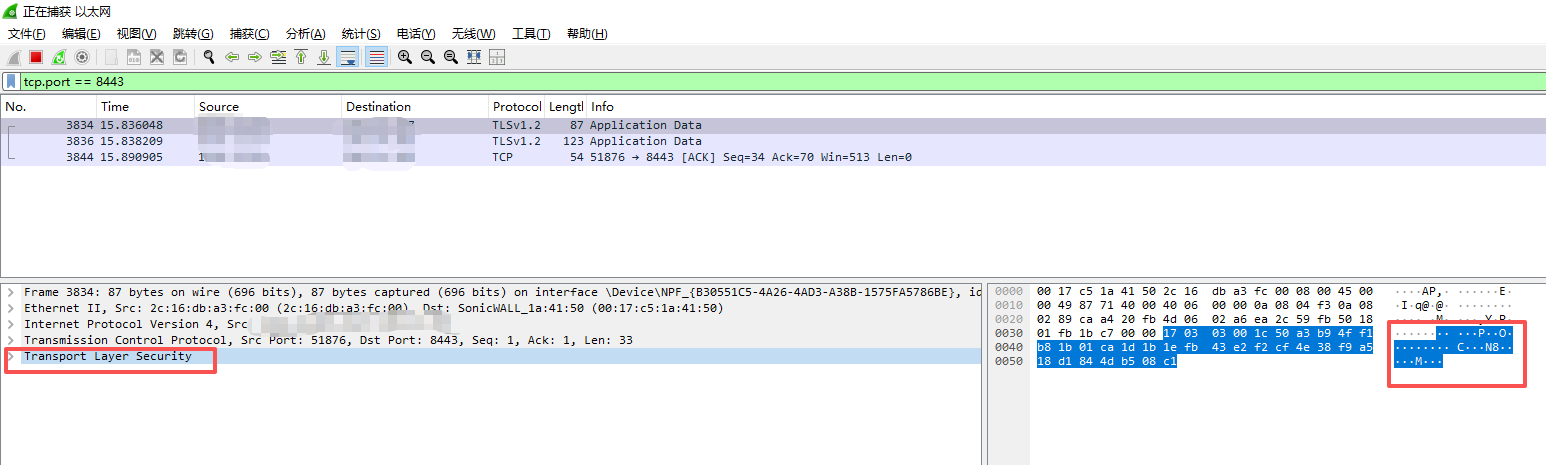 使用了加密证书再次发送"aaaa"数据,可以发现,无法直接看出内容