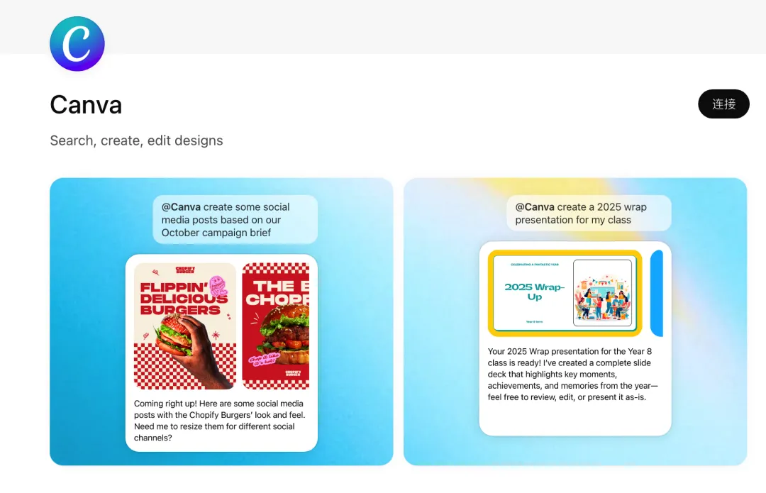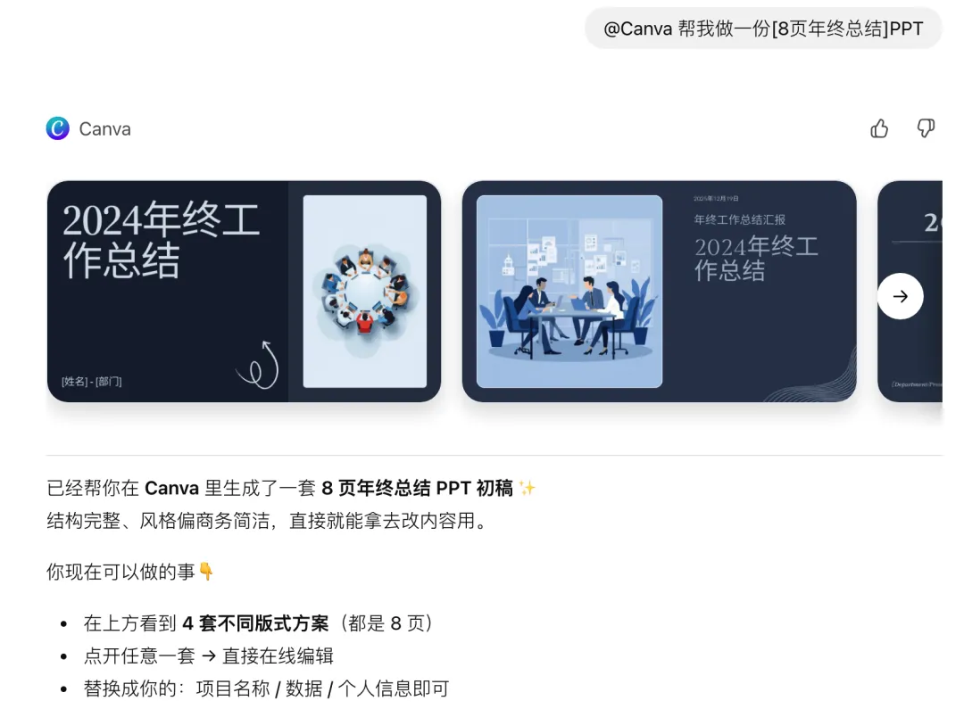 比如我想要用canva帮我写一份年终总结PPT,需要先点击canva,连接授权登录(首次连接需要,以后可以直接@)