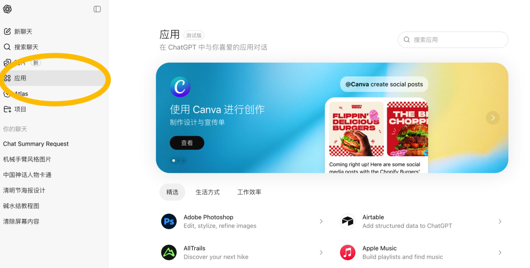 打开ChatGPT网页版左侧菜单找到「应用(BETA)」或直接访问:网址链接