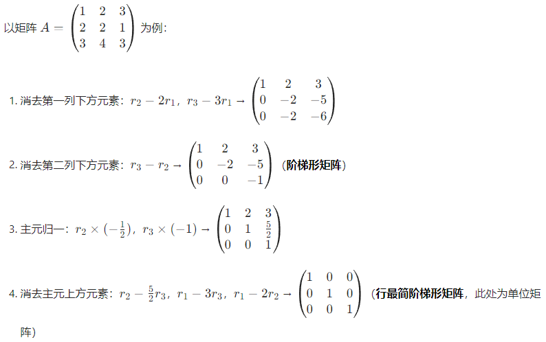 - 阶梯形矩阵:直接读出矩阵的秩(秩 = 非零行的行数);
