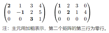 - 各非零行的首非零元(从左到右第一个不为 0 的元素,也称主元)的列标,随着行标的增大而严格增大。