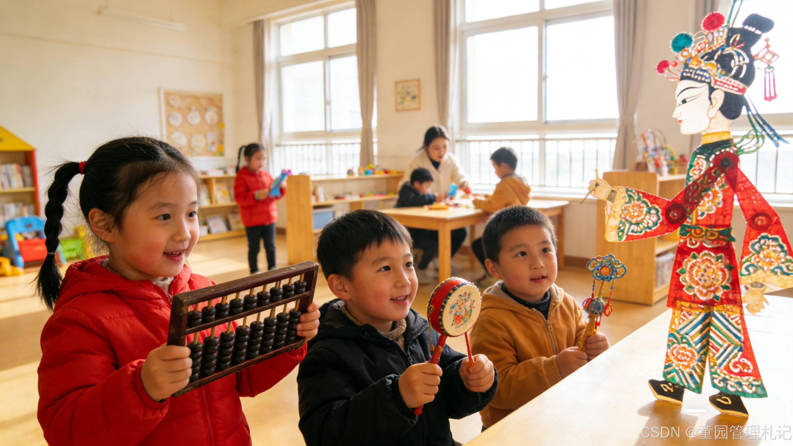 传统文化的渗透,从来不是生硬的灌输,而是融入一日生活的点滴细节。晨间活动时,我们带着孩子们用彩纸裁剪"梅兰竹菊"的简易贴画,在折叠粘贴的过程中,轻声讲述君子品格的小故事;区域游戏中,投放算盘、拨浪鼓、传统皮影等道具,让孩子们在触摸与玩耍中,感知老物件里的时光印记;午餐前的"食育小课堂",则围绕"二十四节气"展开,春分吃春菜、冬至煮汤圆,让孩子们在舌尖的滋味里,记住时节的韵律。