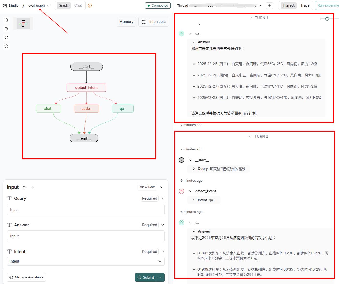 如下图所示,eval_graph为langgraph.json中定义的字段,如果有多个图,可以在这里选择。
