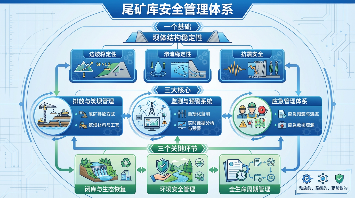尾矿库安全管理是一个庞大而复杂的系统工程,除了至关重要的防洪安全,以下其他方面同样需要高度关注,任何一环的缺失都可能导致重大风险。这些方面可以概括为 "一个基础、三大核心、三个关键环节":