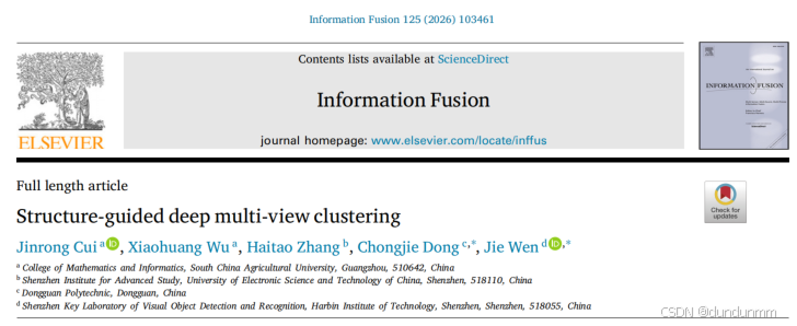 聚类是机器学习中无监督学习的重要研究内容,其目标是在无需标签信息的情况下,将内在相关的样本划分为若干簇。聚类技术在多个领域展现出广泛的应用潜力,包括图像分割 [1,2]、跨模态哈希 [3,4] 以及数据挖掘 [5--7] 等。随着数据来源的日益丰富与多样化,从多个角度对数据进行描述的形式逐渐普遍,这类数据通常被称为多视图数据。在此背景下,多视图聚类(Multi-View Clustering, MVC)逐渐成为研究热点。