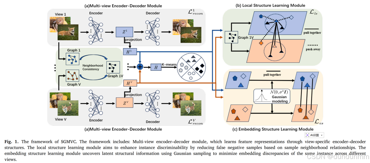 针对上述问题,本文提出了一种结构引导的深度多视图聚类框架 (Structure-Guided deep Multi-View Clustering, SGMVC),其整体结构如图 1 所示。该框架主要由三个模块组成:多视图编码--解码模块 、局部结构学习模块 以及嵌入结构学习模块。其中,多视图编码--解码模块用于从各视图中学习潜在表示;局部结构学习模块通过引入一种精细化的跨视图一致邻域选择策略,增强局部结构信息的提取能力,有效增加可靠的正样本对数量,从而促进样本判别性特征的学习,有利于聚类任务的开展。同时,为进一步挖掘数据中的结构信息,嵌入结构学习模块引入高斯分布以刻画嵌入空间中的结构特征,并通过优化嵌入表示之间的差异,实现更加一致的结构对齐,从而提升聚类性能。