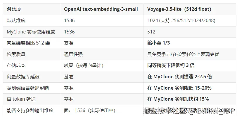 文章重点介绍了 MyClone 将原有 1536 维的 OpenAI text-embedding-3-small 模型替换为 512 维的 Voyage 3.5 Lite 嵌入模型,从而实现 RAG 延迟与存储成本的大幅降低,还能在保持甚至提升检索质量的同时,明显改善用户体验。