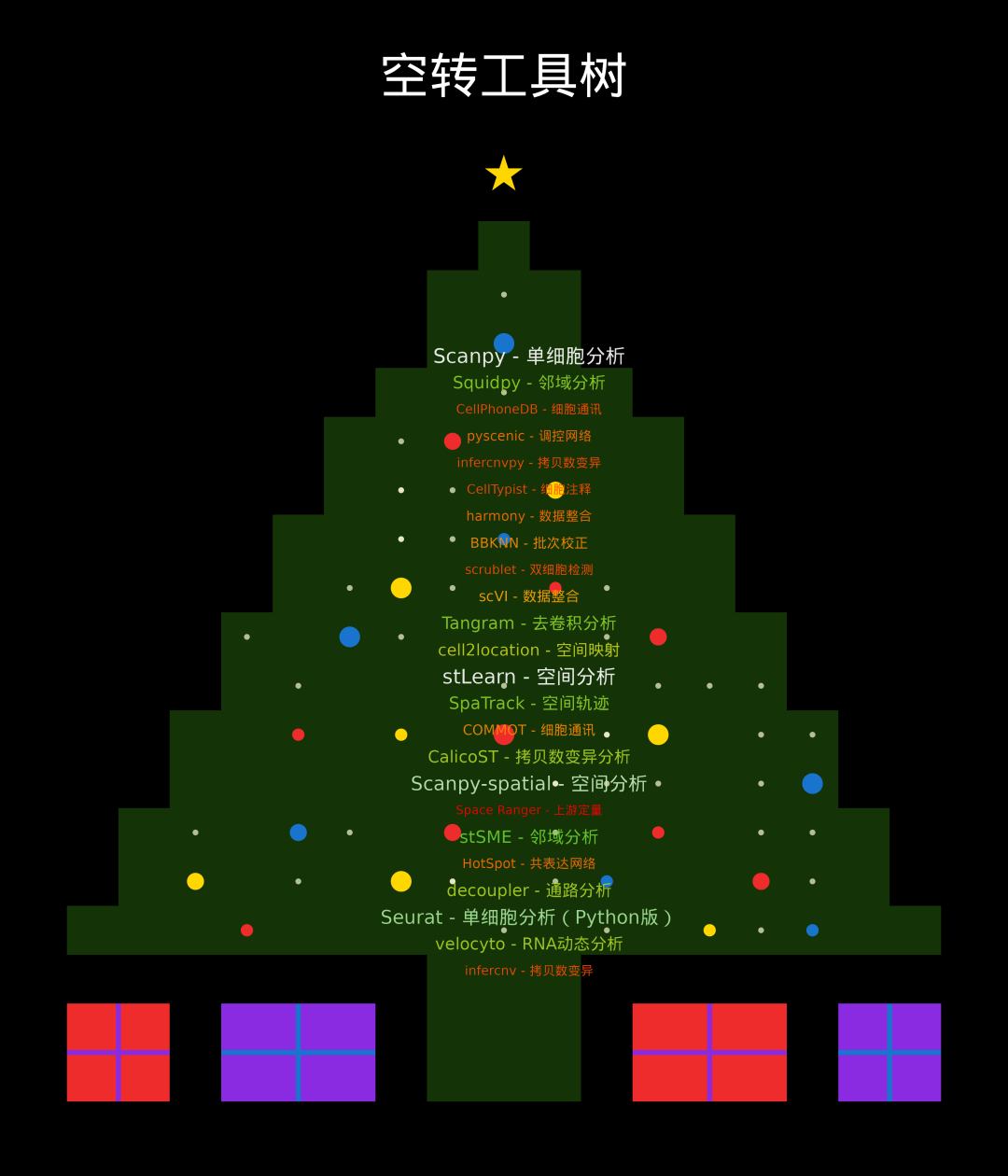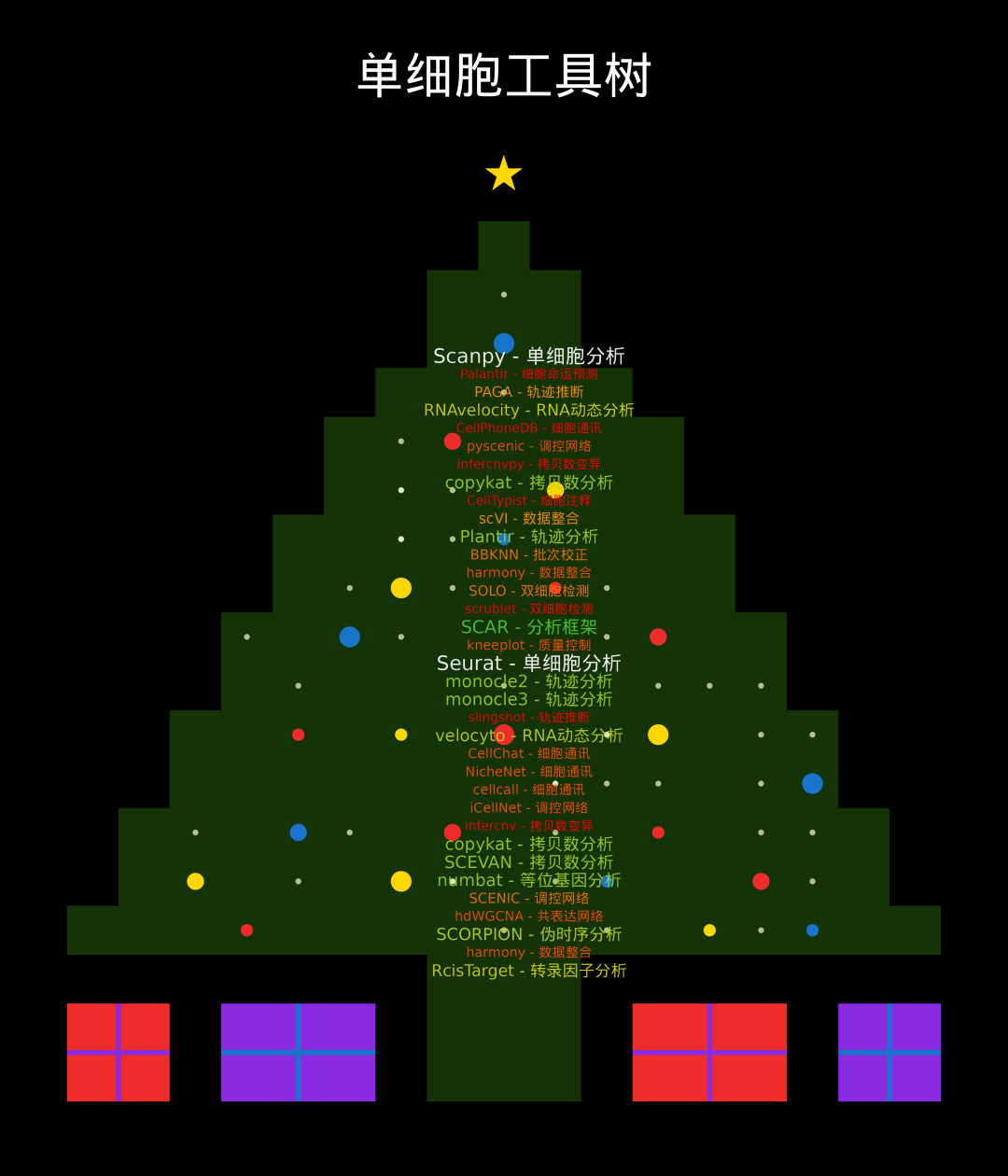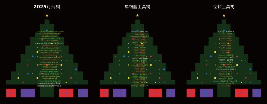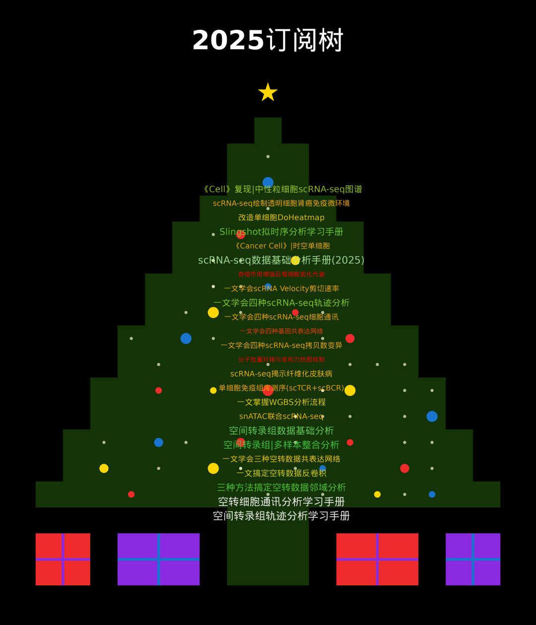 圣诞节来临意味着2025年也快进入尾声,Biomamba 生信基地 在这一年里为大家呈现许多丰富的内容,其中包含三个全程班(R语言 scRNA-seq分析、Python scRNA-seq分析和Python 空间转录组分析)和2025年订阅资料。这里我主要展示我们手册和课程中使用到的工具,并绘制了三个圣诞树:2025订阅圣诞树 ,单细胞工具圣诞树、空转工具圣诞树,供大家学习和参考。(圣诞树代码:参考如何用R语言生成词云和Jodie Burchel的教程[1])