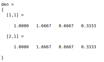 den: p-by-m cell array of row vectors (p = number of outputs)
