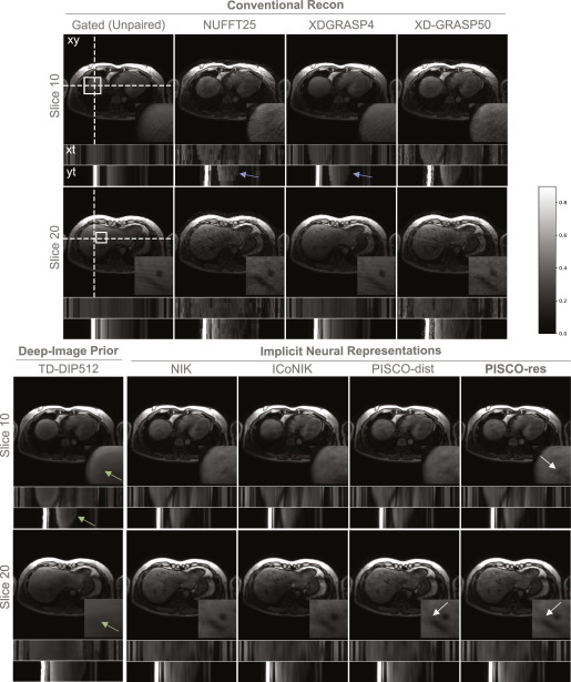 图7腹部 - 呼吸分辨:显示了两名受试者两个切片的定性重建结果:xy图像描绘了空间重建,而时间剖面(由白色虚线标记)表示下方的时间重建(xt/yt)。补充材料中可找到其他示例以及完整动态重建(xyt)的视频。门控重建(与其余部分不配对)不提供任何时间信息,并且仍然模糊(放大图)。尽管XD-GRASP4与NUFFT4相比改善了空间分辨率,但其时间分辨率仍然有限(蓝色箭头)。增加运动状态的数量(XD-GRASP50)导致更好的时间分辨率,但时空重建噪声更大。TD-DIP512在时间域进行了平滑,但在空间维度丢失了任何细节(绿色箭头)。NIK和ICoNIK也减少了时间维度的噪声,但在空间上仍然存在噪声。两种PISCO版本都进一步平滑了时空重建,而本文提出的PISCO-res保持了更清晰的血管结构(白色箭头)。