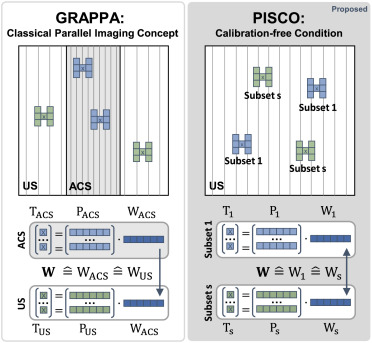 图1.从GRAPPA(Griswold等人,2002)到提出的PISCO:GRAPPA(左图)在一个完全采样的自校准k空间(ACS,灰色区域,公式(1))上校准一个权重向量WACS,其中灰色线条表示采样的k空间点。该向量确定了全局邻域关系W,并用于在欠采样k空间(US,白色区域)中推导出目标点。对于PISCO(右图),多个随机目标和补丁子集(Ts和Ps)被采样以求解Ws(公式(3))。并行成像启发的自一致性(PISCO)条件指出,对于一个理想的k空间,所有这些权重向量都应该平等地收敛于一个单一的全局邻域关系W(公式(4))。