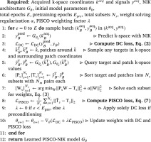 图8算法1. PISCO训练NIK的伪代码。所需:采集到的k空间坐标k^acq和信号y^acq,NIK架构Gθ,初始模型参数θ0,总epoch数E,预训练epoch数Epre,总子集数Ns,权重求解正则化参数α,PISCO权重因子Î>>