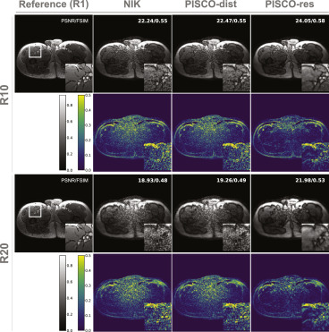 图4.静态上肢:两个示例加速因子(R10/20)的定性和定量结果。NIK重建结果的噪声随加速增加,尤其是在重建中心区域。PISCO-dist对重建的改善微乎其微,仍存在噪声。而本文提出的PISCO-res学习到了更好的隐式表示,从而减少了噪声并使结构更清晰(PSNR和FSIM↑)。
