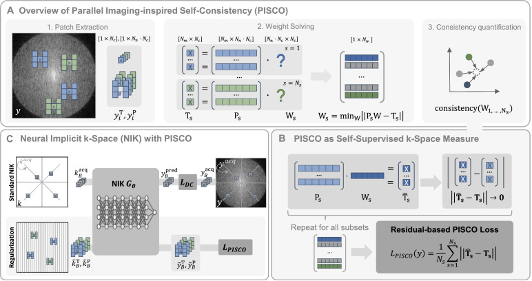 图2.方法概述(A/B/C分别对应第3A/B/C节)。为简化起见,未可视化线圈维度,但矩阵大小已指示。 (A) PISCO:1. 从k空间y中,采样多个子集(一种颜色一个子集),包括目标yiT和补丁yiP对。补丁由相邻值组成,可以假定任何采样形状(见4.2.1节)。2. 每个子集被重塑为线性方程组,并用于使用公式(3)求解邻域关系向量Ws(见4.2.2节)。3. k空间y的PISCO自一致性可以通过所有子集权重向量进行量化,例如,计算距离(Spieker等人,2024a)或残差(本文提出,见B图)。 (B) 基于残差的PISCO作为自监督k空间度量:对于每个子集s,Ws用于仅从其邻域Ps估计目标T^s,并计算与y的实际目标Ts的残差。PISCO损失被确定为所有这些残差的加权和。(C) PISCO集成到NIK训练中:顶部的"监督"部分代表经典的NIK训练(Huang等人,2023),其中对实际采集的坐标进行采样、预测,并使用LDC与采集信号进行比较。通过PISCO,NIK的感知场可以在训练期间扩展,因为可以采样任何补丁(独立于采集轨迹)并用于自监督LPISCO计算。在本研究中,补丁从笛卡尔网格中采样,并在x和y维度上交替欠采样(仅可视化y维度)。