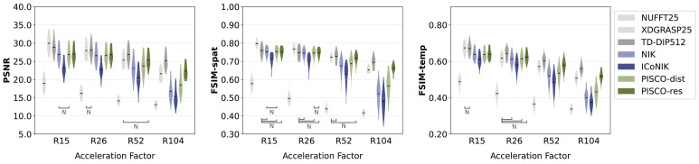 图5.心脏电影:30名受试者在加速因子R15/R26/R52/R104下的定量重建结果(PISCO-dist/PISCO-res重建的λ分别为0.01/0.05/0.1/0.15)。对于R15,XD-GRASP25提供噪声最少的重建(PSNR),并具有高空间和时间分辨率(FSIM-spat/FSIM-temp)。对于R26,NIK、PISCO-dist和PISCO-res导致相似的时间结果。在更大的加速因子下,XD-GRASP25的性能下降,NIK也迅速下降。PISCO-dist优于NIK,但未达到XD-GRASP25。然而,与所有其他方法(R>26)相比,纳入本文提出的PISCO-res显著改善了时间结构。同时,与XD-GRASP25相比,空间重建质量得以保持(R52)甚至显著改善(R104)。所有比较,除了标有"N"的,都具有统计学意义(采用Friedman检验,随后使用Wilcoxon符号秩检验并进行错误发现率(FDR)校正作为事后检验,显著性水平设定为p<0.05)。