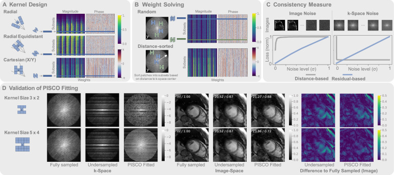 图3.PISCO验证结果。(A) 核设计:对于每种核几何形状,采样多个补丁子集(一个示例以蓝色显示),并求解权重(深蓝色向量)。所有权重向量的幅度和相位堆叠在图中。为验证PISCO条件,所有权重向量应得到相同的解,例如,预期出现垂直模式。只有笛卡尔核(在y方向显示,但在x方向(旋转90°)结果相同)满足此条件。(B) 权重求解:子集权重的解(幅度和相位)垂直堆叠(绿色和蓝色向量是两个示例)。顶部:子集由随机采样的补丁组成。底部:采样的补丁从k空间中心到外侧(白色箭头)排序,然后分成子集。这导致具有相似k空间幅度的补丁子集,从而整体上产生更少噪声的权重向量解。(C) 一致性度量:通过在图像空间(左图)和k空间(右图)中添加递增噪声来模拟非理想k空间。在相应的k空间上,计算基于距离(Spieker等人,2024a)和基于残差(本文提出)的PISCO损失,并按最大损失值进行归一化。对于图像噪声,两种损失都单调增加,而基于残差的损失始终敏感。对于k空间噪声,只有基于残差的损失单调增加,使其可用于优化以达到理想k空间(其中σ=0)。(D) PISCO拟合验证:PISCO拟合欠采样k空间的结果(k空间左图,图像中间图)。在k空间内,包含PISCO可以在没有任何额外知识的情况下推导出缺失的k空间线。独立于核大小,与原始欠采样图像相比,使用PISCO的重建结果导致欠采样减少,这在图像(中间图)以及定量PSNR/FSIM结果和差异图像(右图)中定性可见。更大的核(5x4,底部)增加了感知场并填充了更多缺失的k空间线,但由于更多的未知核权重Nw也需要更多的计算能力。
