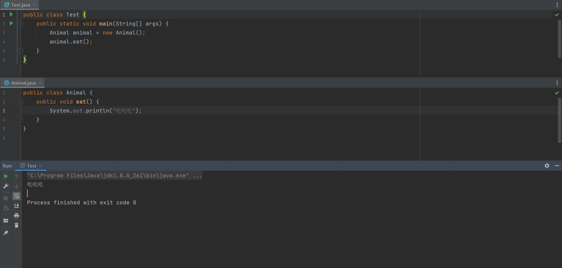 若 Animal() 和 main() 在同一个类里,在 main() 中调用 eat() 方法可以直接使用 eat(); ,如图: