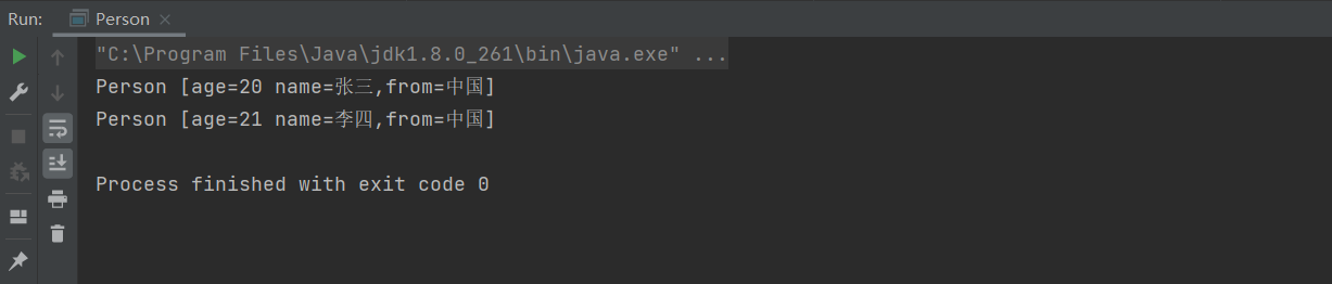 return "Person [age=" + age + " name=" + name + ",from=" + from + "]";