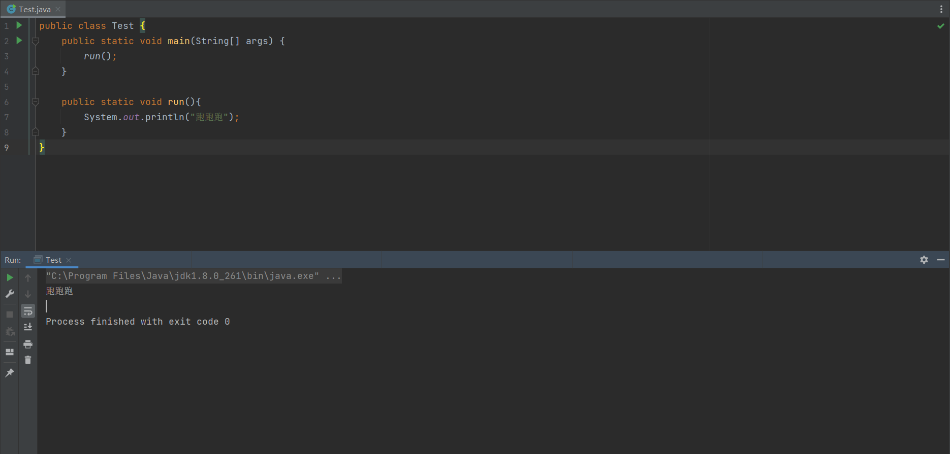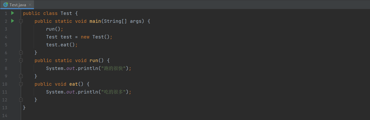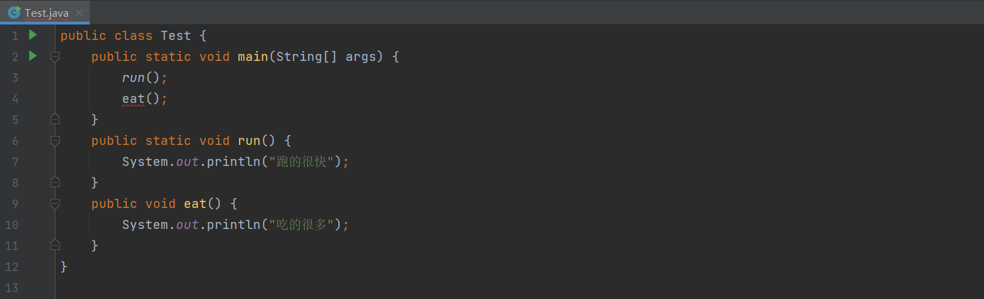 这里 run() 方法带 static 关键字,而 eat() 方法不带 static 关键字,在 main() 方法中直接调用 eat() 方法时会产生报错,关键点是类和对象的区别。