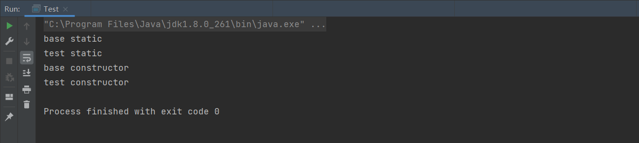 简单来说:先创建父类的 static 代码块输出 "base static" 再创建子类的 static 代码块输出 "test static",这个过程属于扫描过程。然后 main 方法入栈,之后 new test() 创建当前子类对象,但创建子类对象的是先创建父类对象,所以在这个地方先表达的是这个 base 功能函数输出 base constructor,然后回过头来再创建输出 "test constructor"。