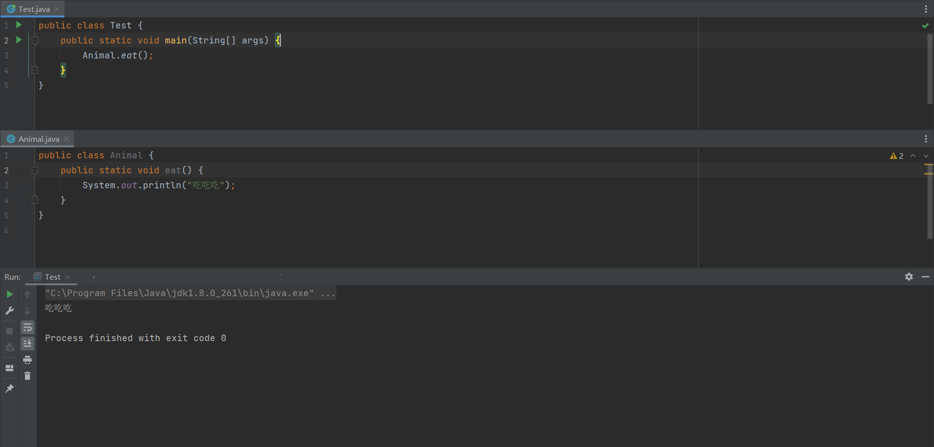 Animal() 和 main() 在不同类里,在 main() 中调用 eat() 方法使用的是 Animal.eat();