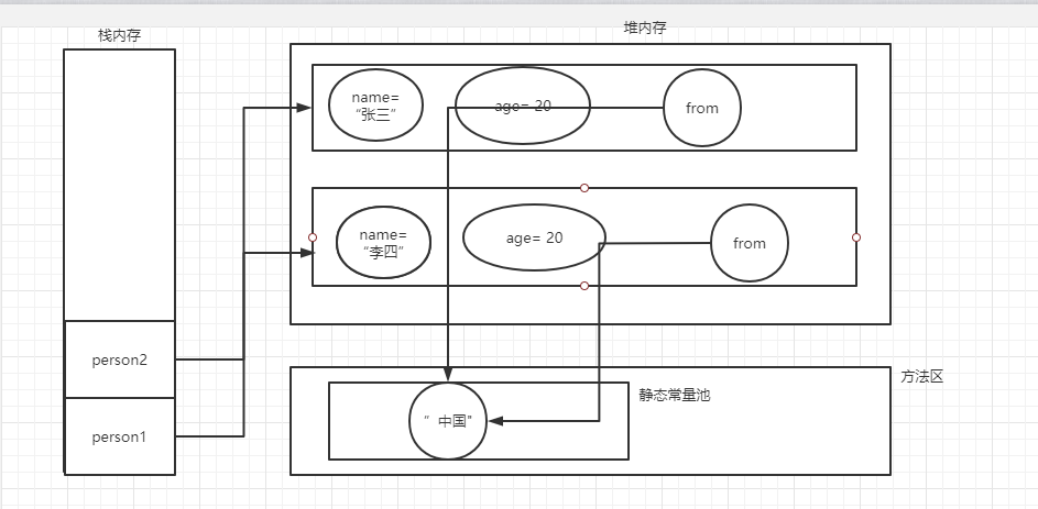 总结:person1 和 person2 的 name 和 age 属性的值都在堆内存当中进行存储,且是该对象私有的,但是 from 属性值是存储在方法区的静态常量池当中的,是属于公共的。