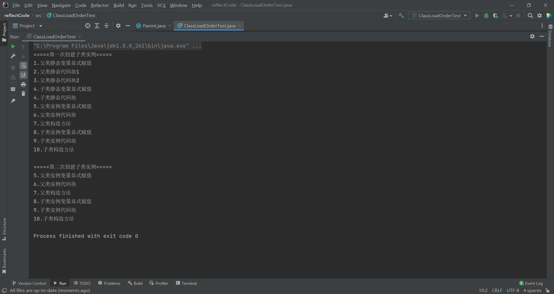 父类 Parent 的静态初始化(仅执行 1 次):按代码书写顺序执行父类的静态资源(静态变量显式赋值 + 静态代码块);