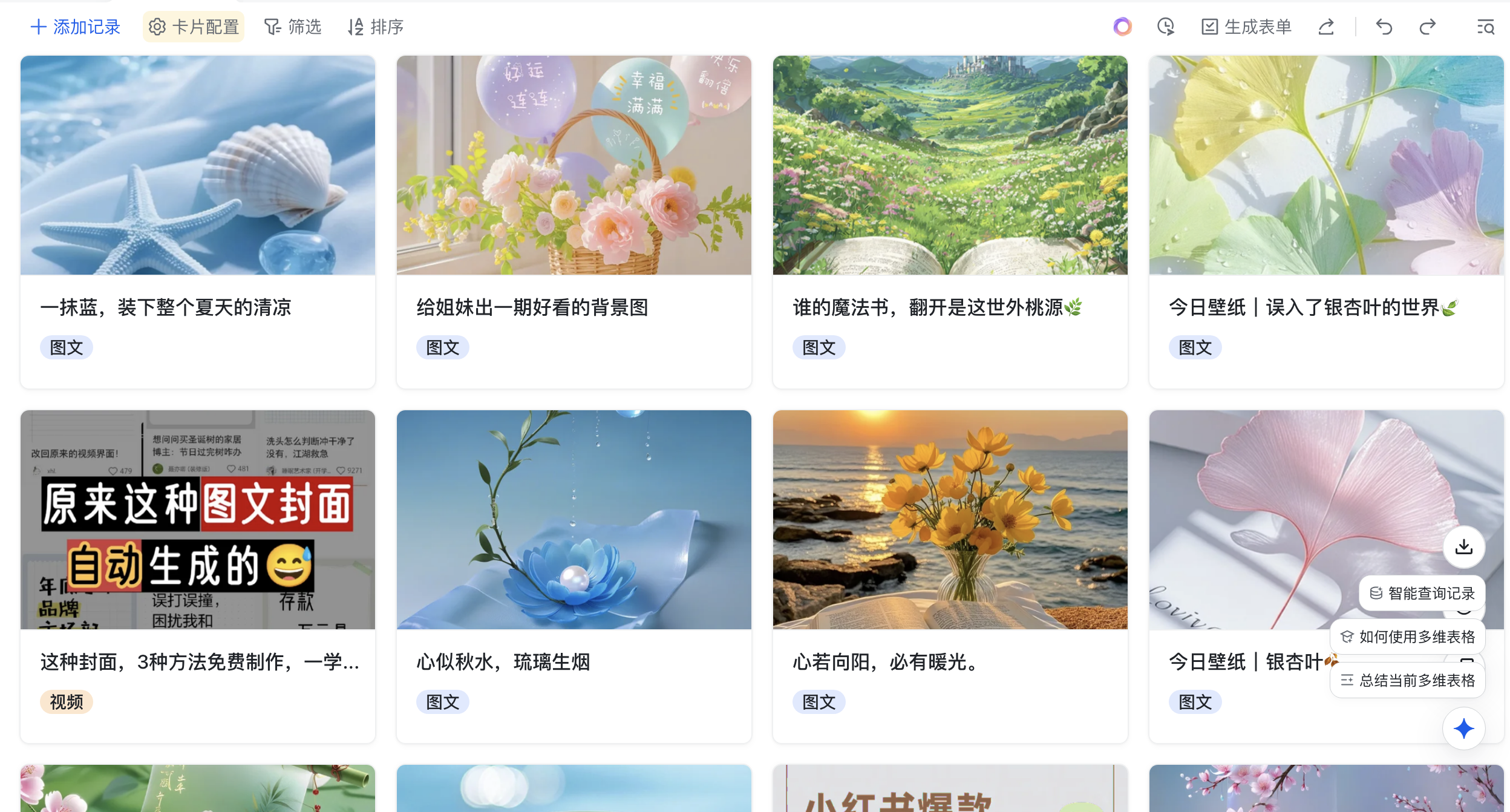 我一般还会同步到飞书表格里,方便团队一起看,做成画册模式更直观。