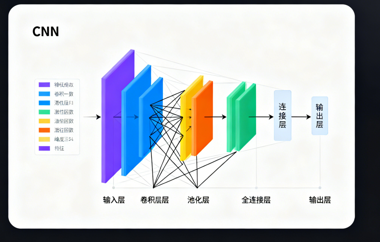 卷积神经网络(Convolutional Neural Network, CNN)是一种专门用于处理具有网格结构数据(如图像、语音)的深度学习模型。与传统的全连接神经网络相比,CNN通过引入卷积操作、池化操作等核心机制,有效降低了模型的参数数量,解决了全连接网络在处理高维度图像数据时易出现的过拟合和计算量过大问题,因此在计算机视觉领域(如图像分类、目标检测、图像分割等)得到了广泛应用。