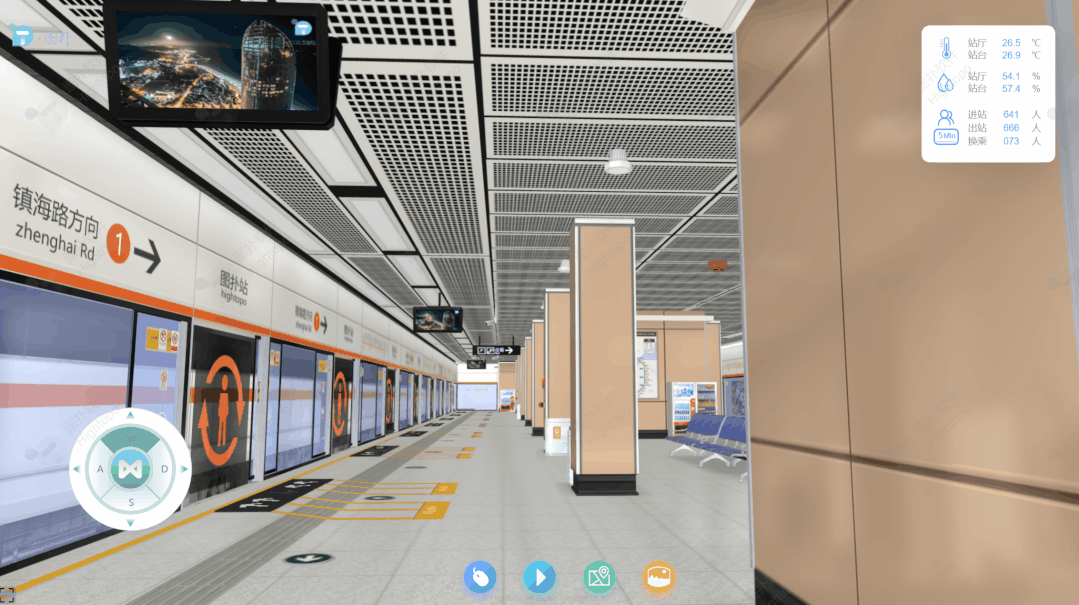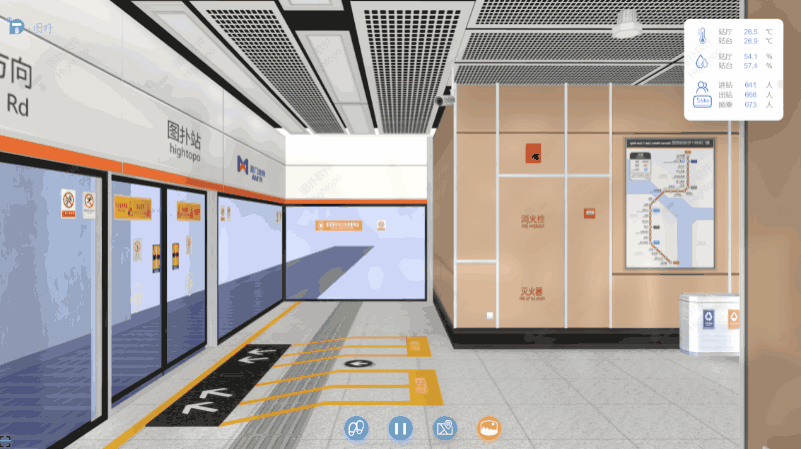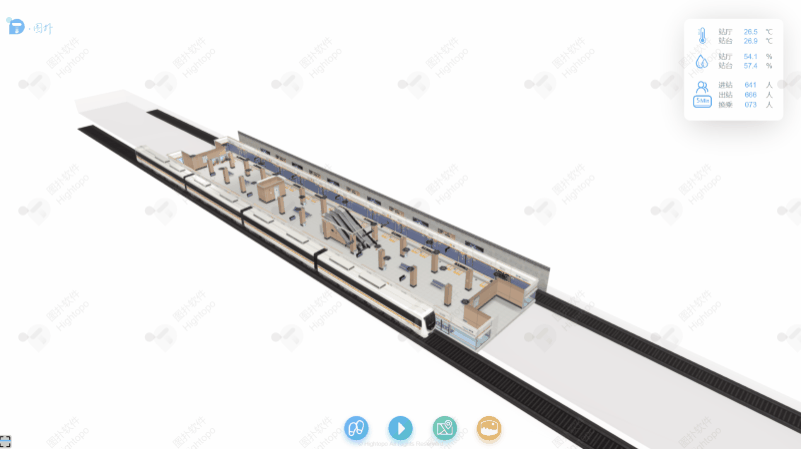 地铁站三维场景的构建遵循 "精准还原、高效渲染" 的原则。首先,以地铁站 CAD 设计图纸、现场实拍照片、设备技术参数文件为基础素材,在专业建模软件中进行精细化建模。建模过程中采用多边形简化、纹理压缩、细节层次(LOD)优化等技术,在保证模型精度的前提下降低资源占用。完成建模后,将模型导出为 HT 引擎支持的格式,导入至 HT for Web 平台,最终构建出 1:1 比例还原的地铁站三维虚拟场景,实现对站厅、站台、设备布局等物理空间的数字化复现。