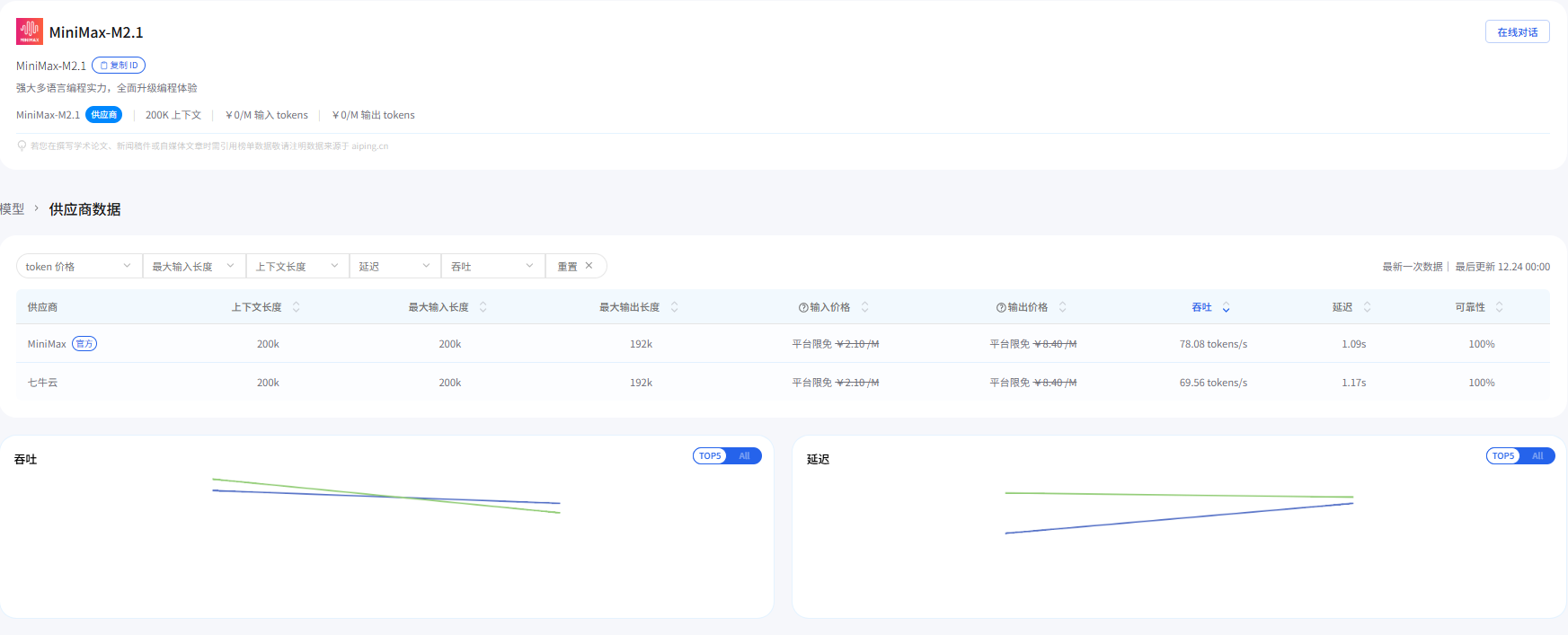 GLM-4.7 与 MiniMax M2.1 的这次上线,最值得关注的不是某一条基准测试分数,而是它们对工程链路的覆盖:前者更利于复杂任务的稳定完成,后者更利于长链路与持续迭代的效率。而 AI Ping 让这件事更容易落地:你能看到不同供应商的真实表现,用统一接口完成接入,并通过路由策略把稳定性与效率做成可配置的工程能力。
