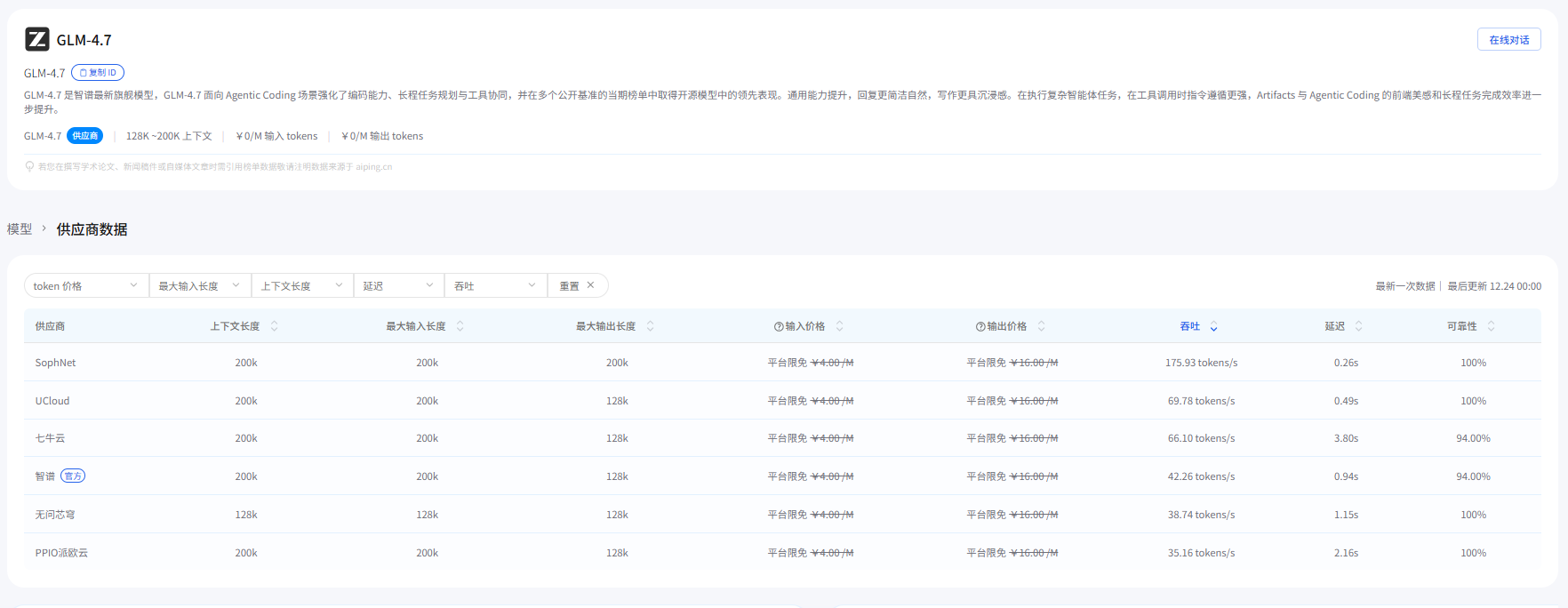 AI Ping 公布了平台实测数据。把关键指标整理如下(输入/输出价格在表中为免费,可靠性为 100%):