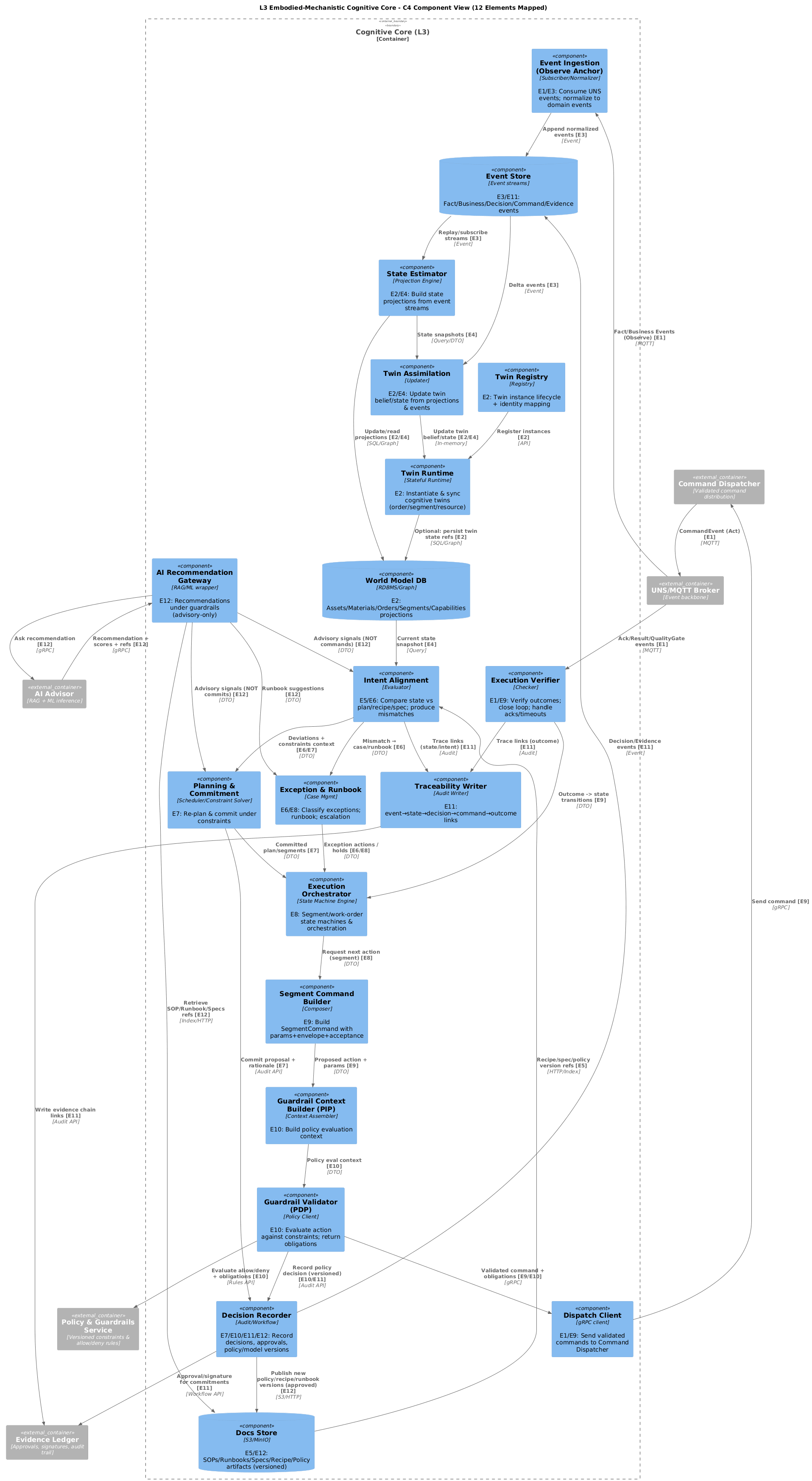 L3 的"具身智能"源自 一个机制化的运营认知体:用事件驱动的状态估计与意图对齐,在护栏约束下生成可验证的段级行动,并用证据链闭环塑形世界模型与策略。